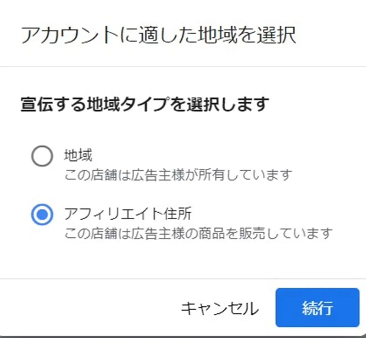 - アカウントに適した地域を選択より「アフィリエイト住所」を選択し、続行をクリック