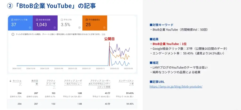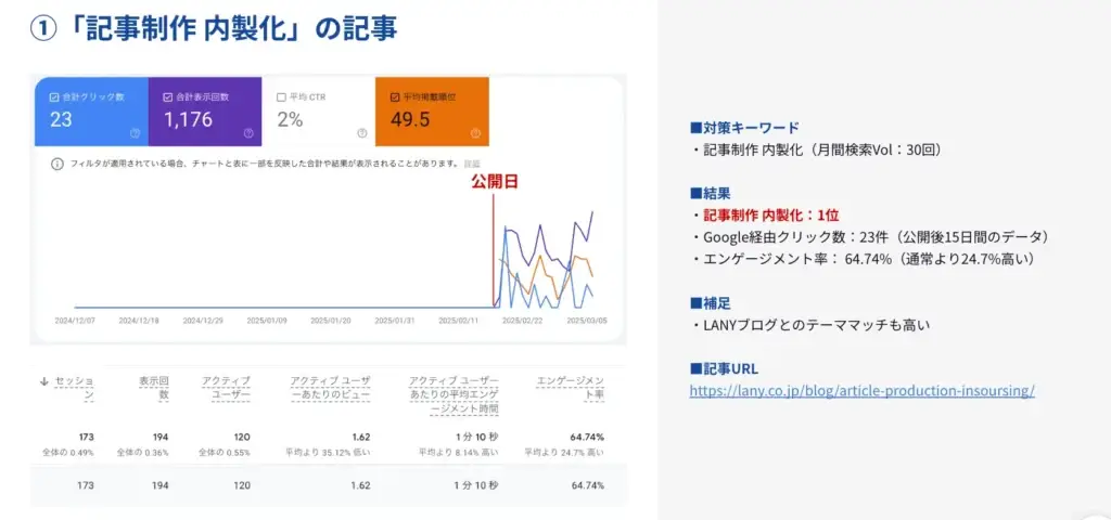 実際に、LANYブログでは「記事制作 内製化」や「YouTube BtoB企業」などのキーワードで記事を制作し、SEO流入を獲得しながら、内製化支援やYouTube運用代行といった自社サービスのリード獲得にも貢献しました。