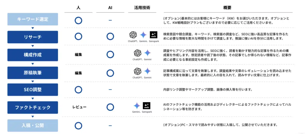 さらに、制作フローにはファクトチェックや校正を含め、生成AIや文賢・CCDなどのツールも活用しながら、人間の目だけでは気づけないミスや抜け漏れも防いでいます。