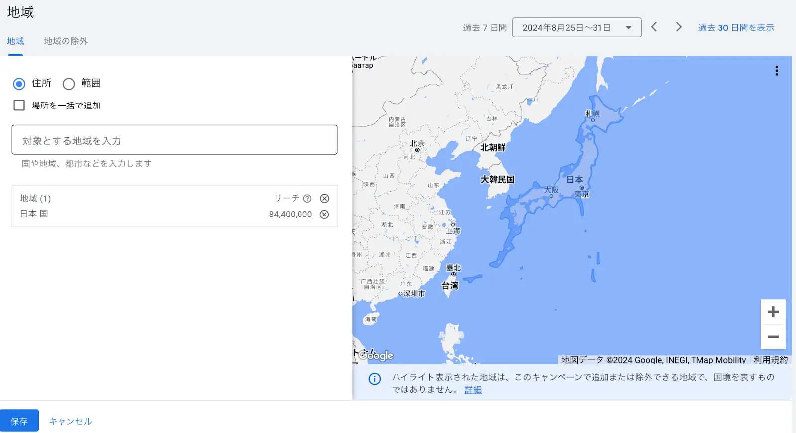地域設定は適切に設定しないとターゲット地域のユーザーに配信できなくなる可能性があります。