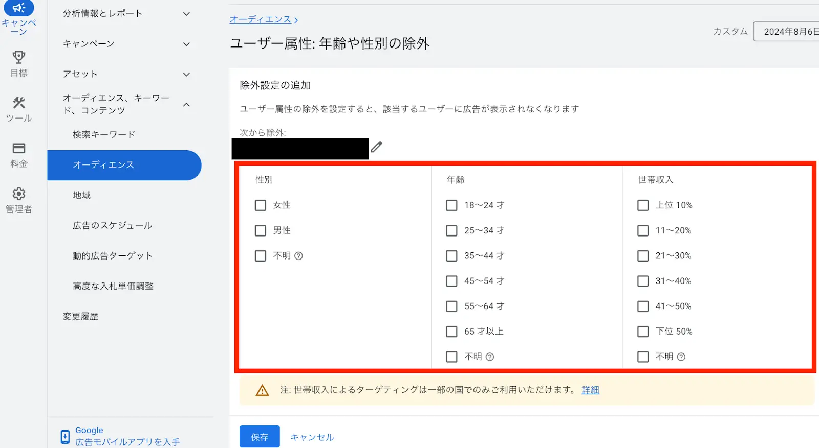 また、上記の選択変更は、「キャンペーン」>「オーディエンス、キーワード、コンテンツ」>「オーディエンス」>「ユーザー属性: 年齢や性別の除外」を切り替えて保存を押します。