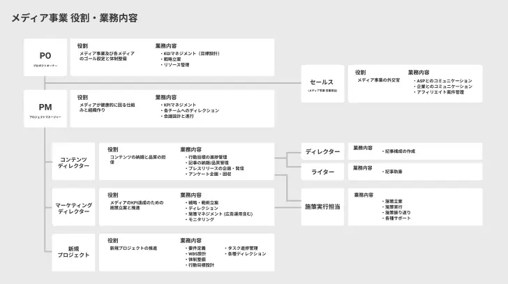 A. PM(プロジェクトマネージャー)の下に、記事制作を担うチームとSEOやCROを担うチームの2つを置く形が推奨されます。役割を分けて行動目標を設定することで、仕組みとしてメディアが回りやすくなります。