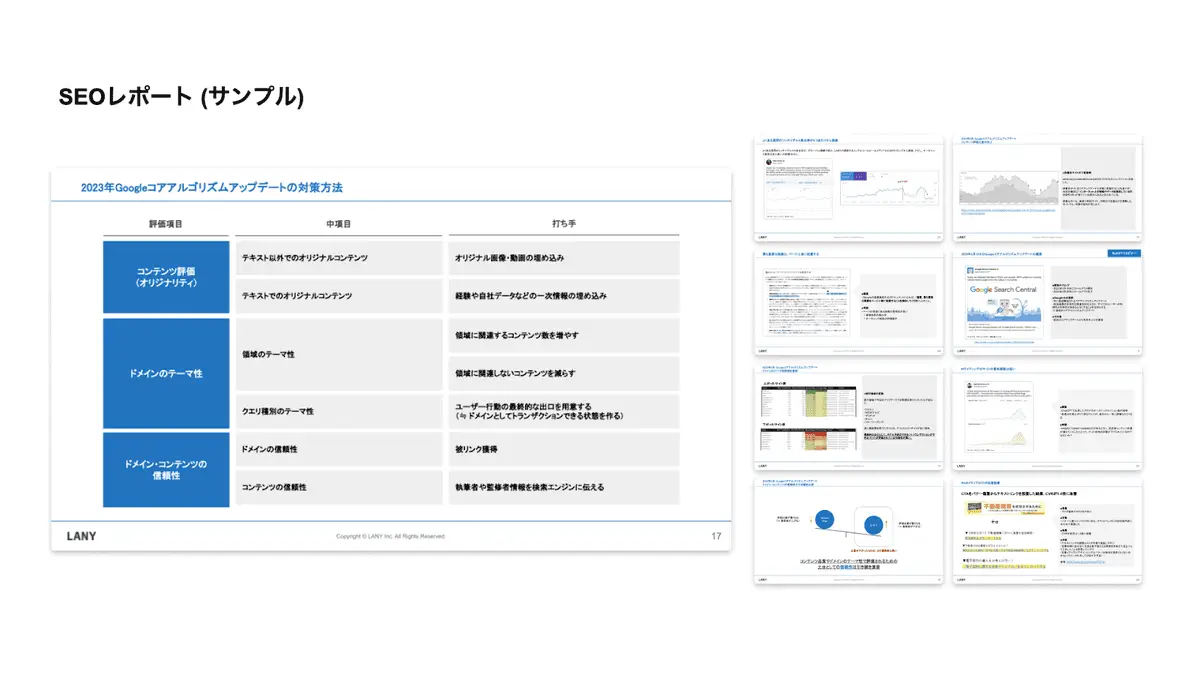 他にもSEOのレポートを出してくれる会社はあると思いますが、施策事例まで盛り込まれているところはおそらくないんじゃないかなと。